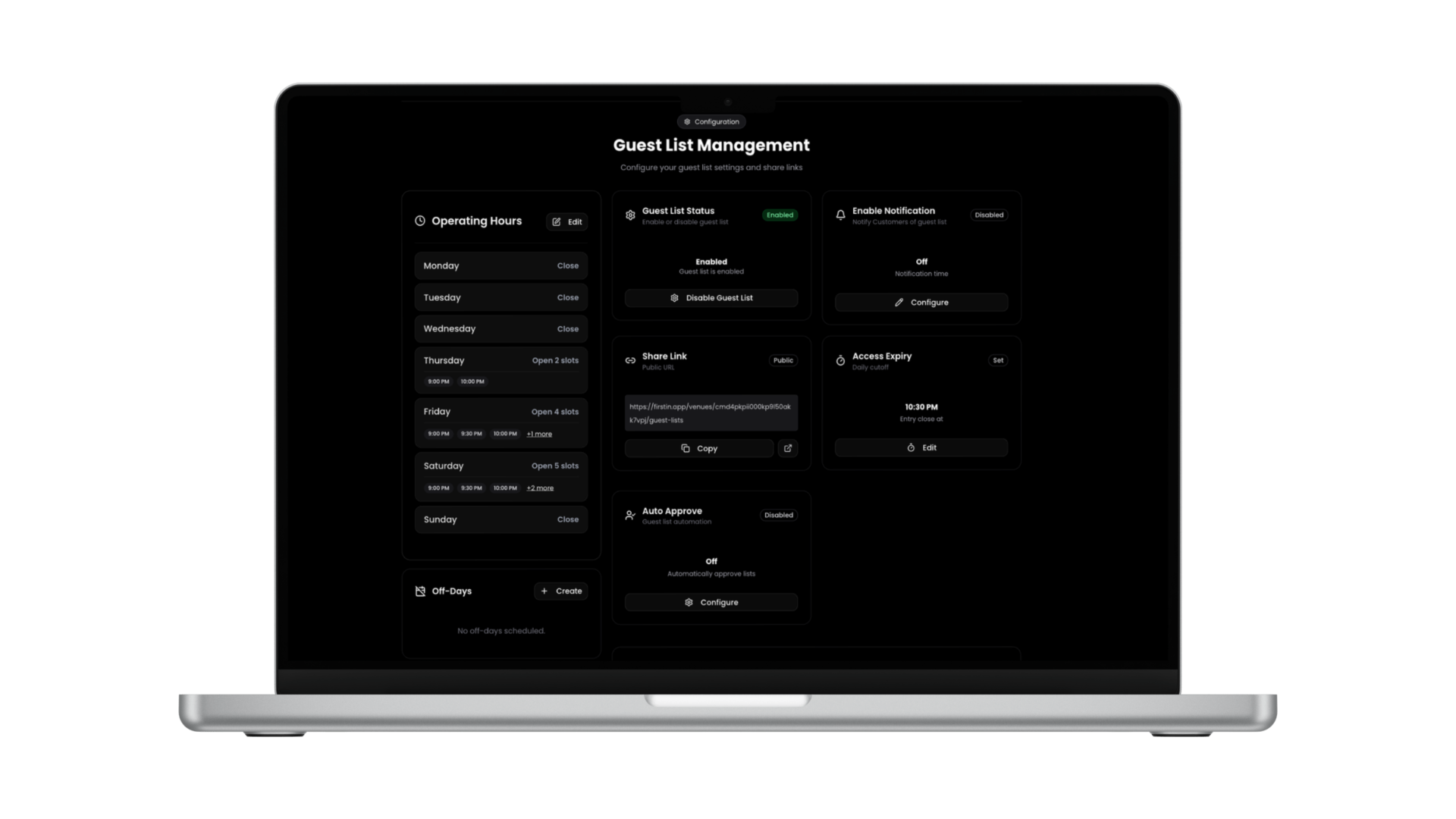 Set up your event, define auto-approval rules, cutoff times, and capacity limits — all from one dashboard.